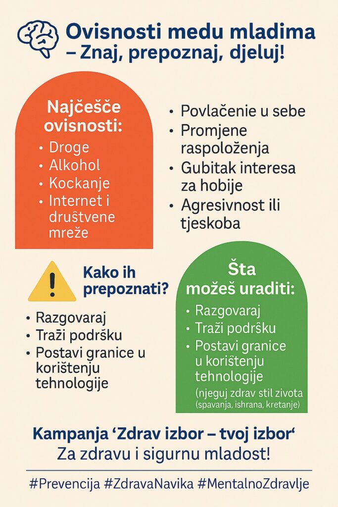 Upotreba opojnih droga, alkohola, kockanja i drugih oblika ovisnosti među adolescentima predstavlja globalni izazov, ali sa snažnim lokalnim posljedicama. Mladi su, zbog svoje razvojne dobi, emocionalne osjetljivosti i često nedovoljne informiranosti, izloženi većem riziku od razvoja ovisnosti, što može ostaviti dugoročne posljedice po njihovu budućnost.